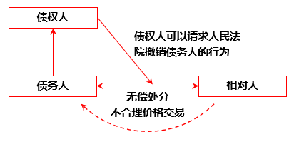 債務(wù)人以明顯不合理的低價(jià)轉(zhuǎn)讓財(cái)產(chǎn)、以明顯不合理的高價(jià)受讓他人財(cái)產(chǎn)或者為他人的債務(wù)提供擔(dān)保,影響債權(quán)人的債權(quán)實(shí)現(xiàn),債務(wù)人的相對(duì)人知道或者應(yīng)當(dāng)知道該情形的,債權(quán)人可以請(qǐng)求人民法院撤銷(xiāo)債務(wù)人的行為。