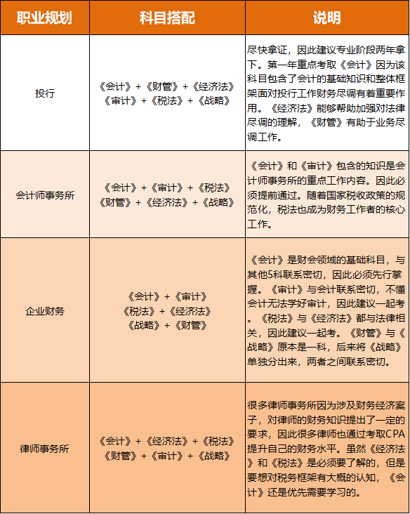 上圖為不同職業(yè)規(guī)劃的考生考取CPA時的科目搭配推薦,主要是根據(jù)工作性質進行簡單的推薦,考生們可以在實際工作中根據(jù)工作要求和具體的備考時間合理搭配。