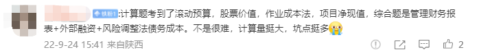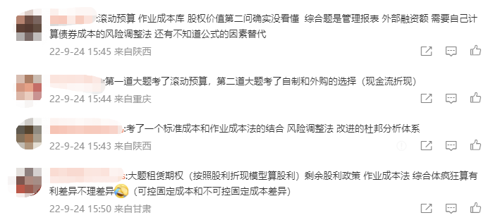 根據(jù)考生們的即時反饋,注會延考地區(qū)《財管》試卷涉及到滾動預算、作業(yè)成本庫、股權(quán)價值、標準成本法、作業(yè)成本法、杜邦分析體系等考點。整體計算量偏大,“坑”點較多。