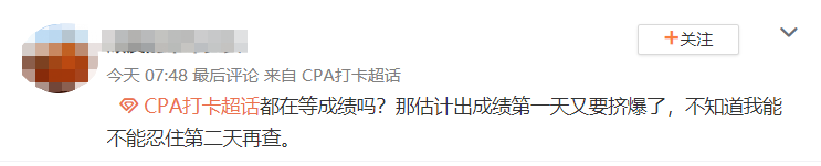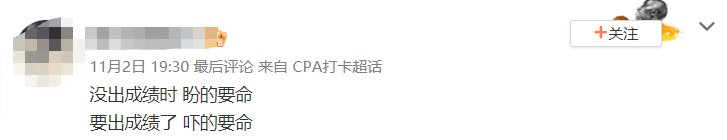 中注協(xié)在注會(huì)報(bào)名簡章中沒有明確規(guī)定出分具體日期,只表明將于2022年11月下旬公布成績。不僅考生們時(shí)刻關(guān)注,就連小編也會(huì)每天登錄網(wǎng)報(bào)系統(tǒng)和微博超話查看注會(huì)查分新動(dòng)態(tài)。注會(huì)成績代表著考生們一年來的奮斗成果,大家等出分的焦急心情溢于言表……