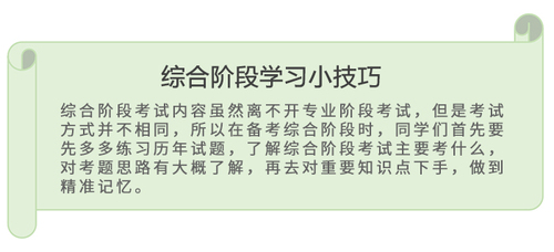 六科考試成績合格的同學也不可以松懈,接下來等待你的是綜合階段考試,綜合階段考試的兩個考試科目基本涵蓋了六個科目考試的內(nèi)容。