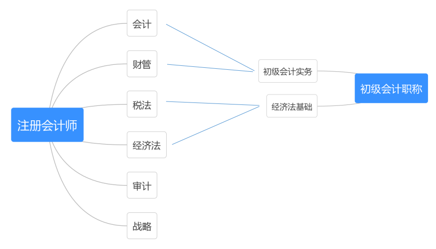 如下圖,注會專業(yè)階段考試中,會計和財管科目與初級會計職稱考試的初級會計實務(wù)有較高的契合度。而稅法和經(jīng)濟法則與初級會計職稱的經(jīng)濟法基礎(chǔ)相契合。