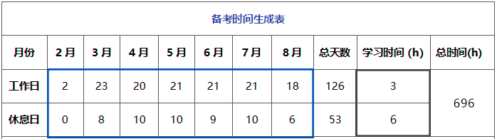 例如:從2月27日開始,接下來的每一天都學習,工作日學習3小時,休息日學習6小時,那么在8月25日考試之前,共能學習696小時。