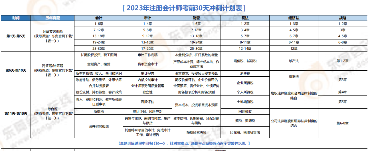 以下是2023年注會考前30天沖刺學習計劃表(例圖展示),明確標明各個時間段需要完成的學習任務,玩轉歷年試題,結合其他資料,穩(wěn)步沖刺提升!
