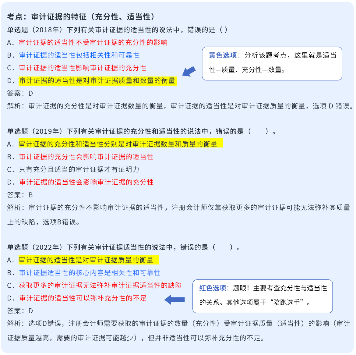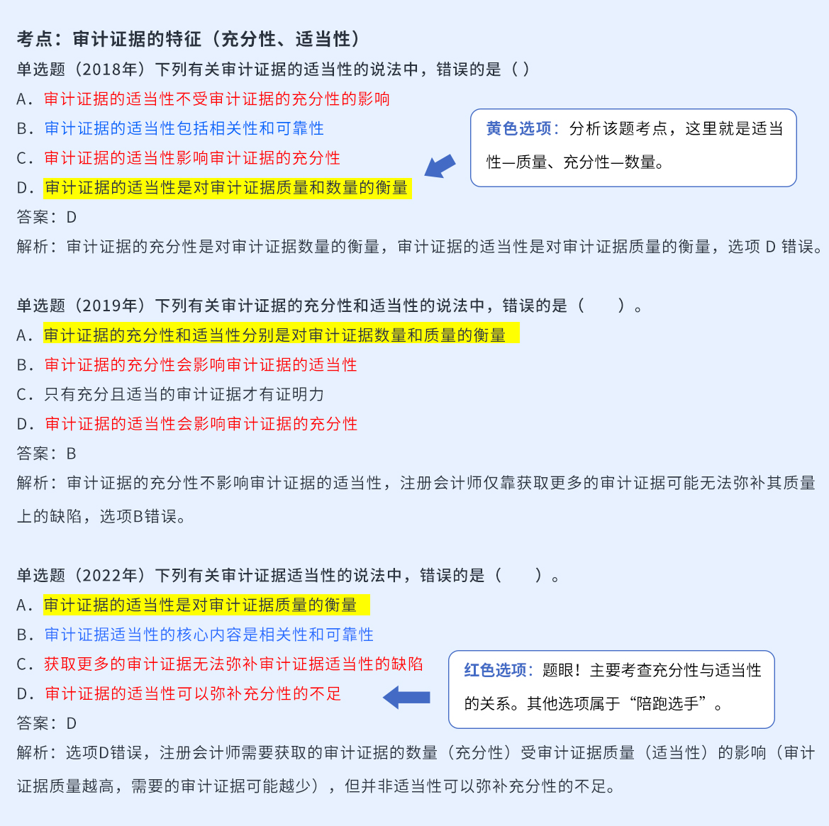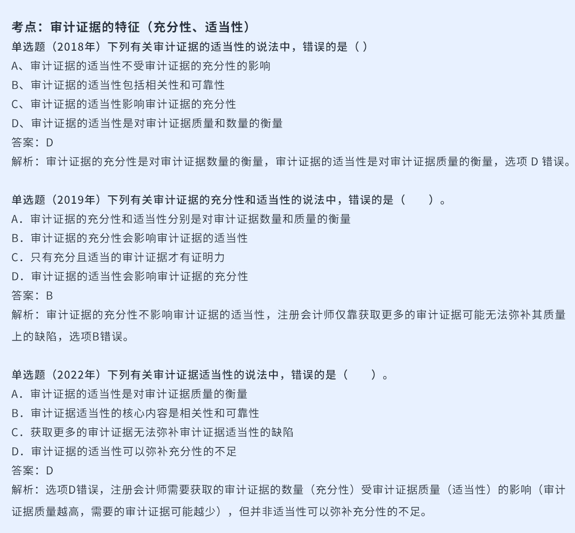 首先,明確以上案例中的考點是“審計證據(jù)的充分性與適當性的辨析(定義與辨析)”,近3年均有考查,屬于重要知識點。