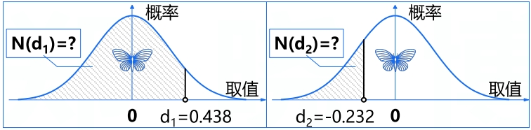 (二)設(shè)d2=-0.232,那么,這一隨機變量的取值小于d2的概率是多少?(記做N(d2));相當(dāng)于計算下右圖中陰影部分的面積。