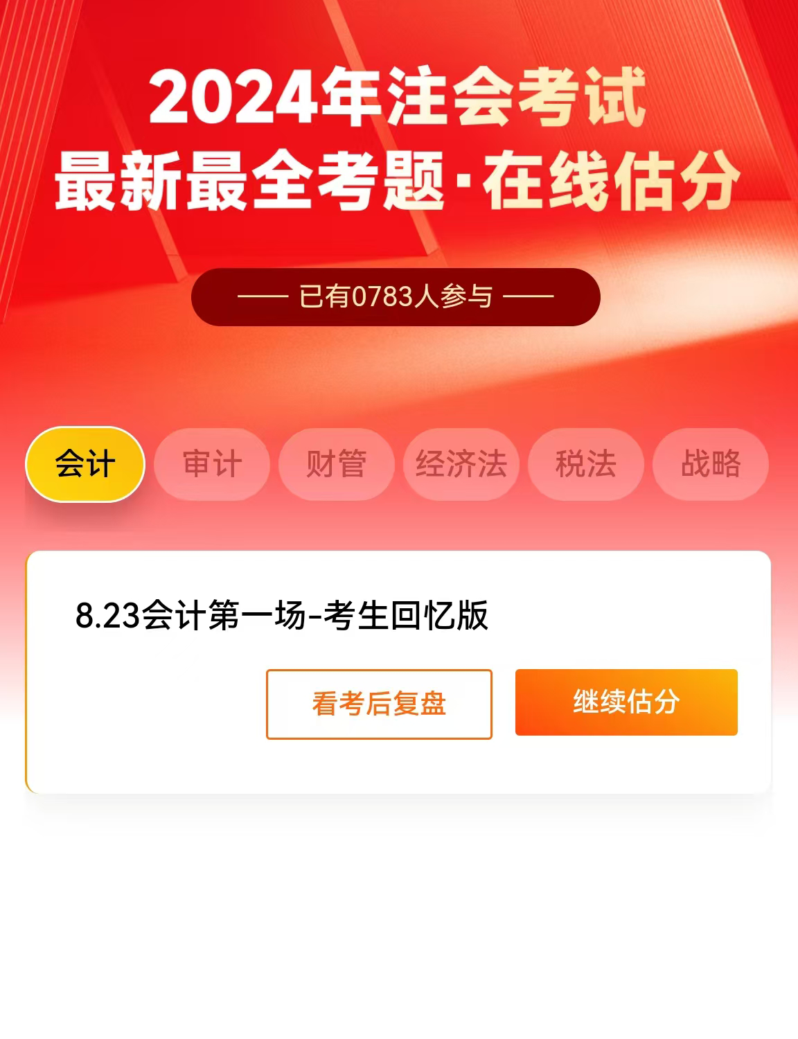 估分試題、參考答案及解析由東奧教研團(tuán)隊根據(jù)考生回憶整理并解答提供,考生可根據(jù)回憶選擇每道題答案,完成后系統(tǒng)會根據(jù)考生選擇結(jié)果進(jìn)行估分,成績僅供參考,最終成績請考生以官方結(jié)果為準(zhǔn)!此外東奧還開展了有獎?wù)黝}活動,點(diǎn)擊參與活動,贏獲獎機(jī)會>>2024年注會考試成績下發(fā)時間預(yù)計為11月下旬,預(yù)祝各位考生都能取得理想的成績!