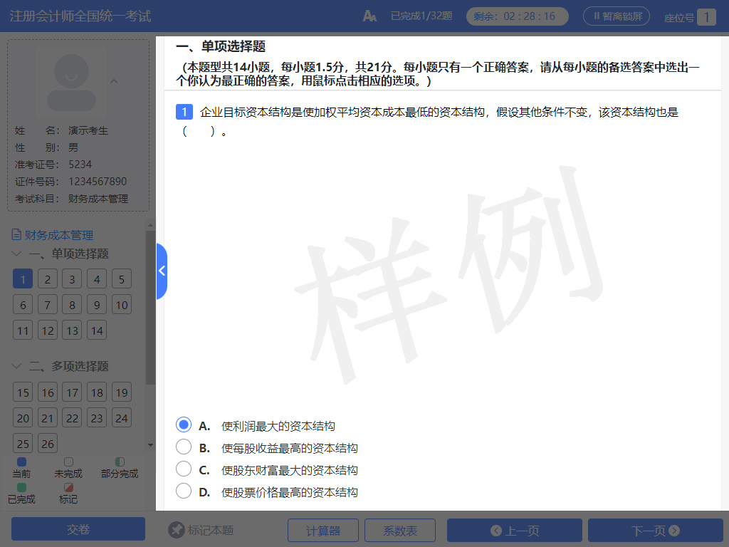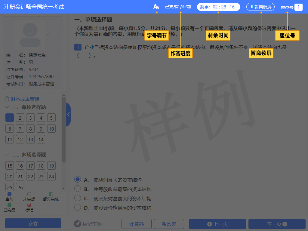 作答進(jìn)度:考生可以查看已答試題的題量和總題量。