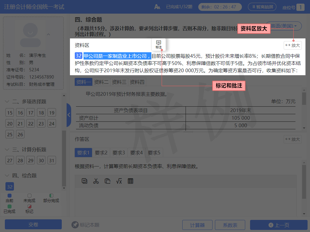(7)考生對(duì)資料區(qū)使用標(biāo)注功能,不會(huì)被作為答題結(jié)果,也不會(huì)影響考生得分情況。