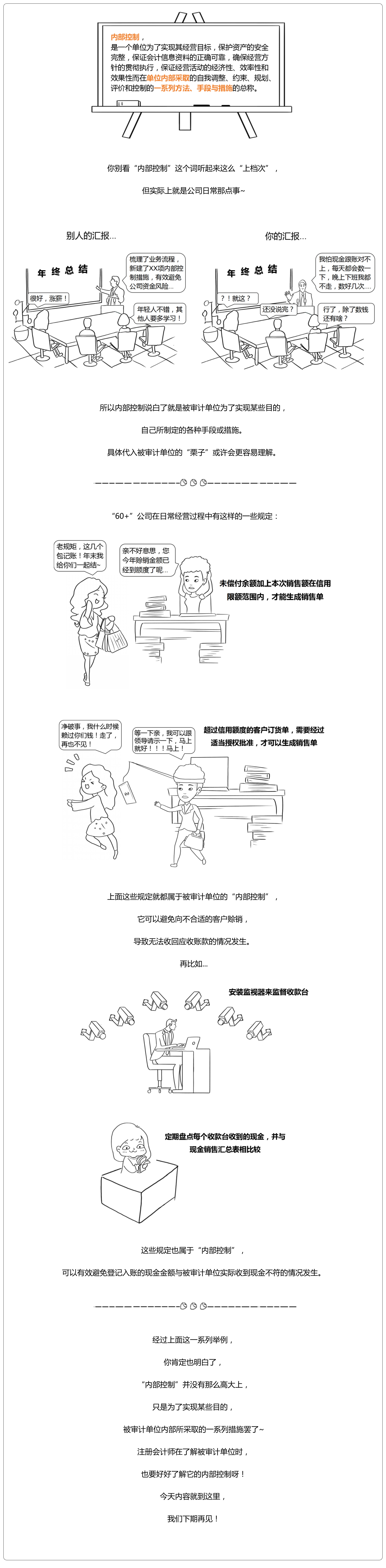注冊會計師在了解被審計單位環(huán)境時,需要了解被審計單位的內部控制,那到底什么是內部控制呢?今天就讓我們用文字+漫畫的趣味形式帶大家來了解一下內部控制的內涵,趕快一起進入到審計零基礎入門——名詞新語第十二回:內部控制吧!