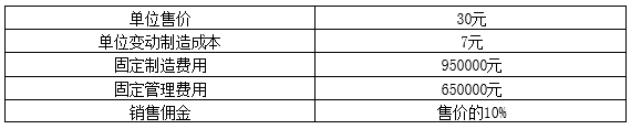銷售傭金是變動成本,盈虧臨界點銷售量=(950000+650000)/(30-7-30×10%)=80000(件)。