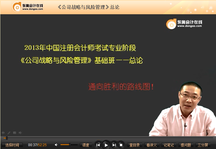 知識點概述:本節(jié)課程是東奧2013年注會考試《公司戰(zhàn)略與風險管理》基礎班的部分節(jié)選內容,本節(jié)內容主要講解的是《公司戰(zhàn)略與風險管理》之總論,呂鵬老師在課上為考生講解了總論的學習目的 、總論的主要講解內容、2013年《公司戰(zhàn)略與風險管理》考試大綱解讀等內容。