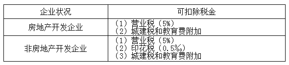 包括轉(zhuǎn)讓房地產(chǎn)時(shí)繳納的營(yíng)業(yè)稅、城建稅、印花稅。教育費(fèi)附加和地方教育附加視同稅金扣除。