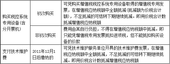 增值稅納稅人2011年12月1日(含,下同)以后初次購買增值稅稅控系統(tǒng)專用設(shè)備(包括分開票機)支付的費用以及繳納的技術(shù)維護費,可在增值稅應(yīng)納稅額中全額抵減。具體規(guī)定如下表: