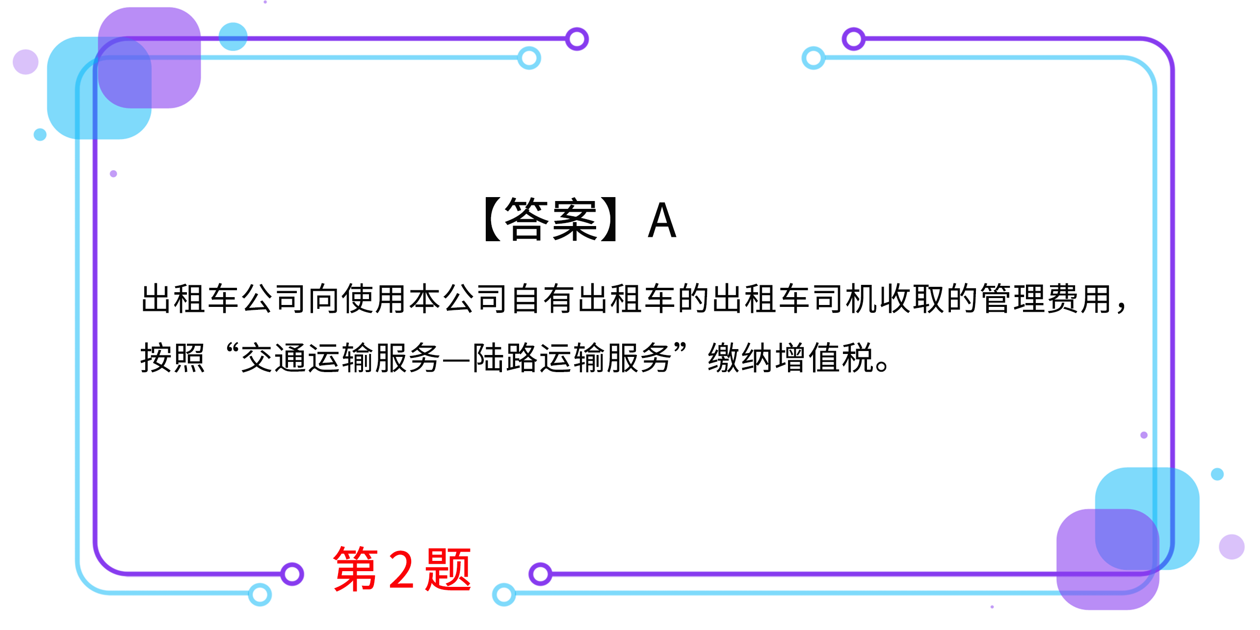 2.出租車公司向使用本公司自有出租車的司機(jī)收取管理費(fèi)用,應(yīng)繳納增值稅。該業(yè)務(wù)屬于增值稅征稅范圍中的( )。(2019年)