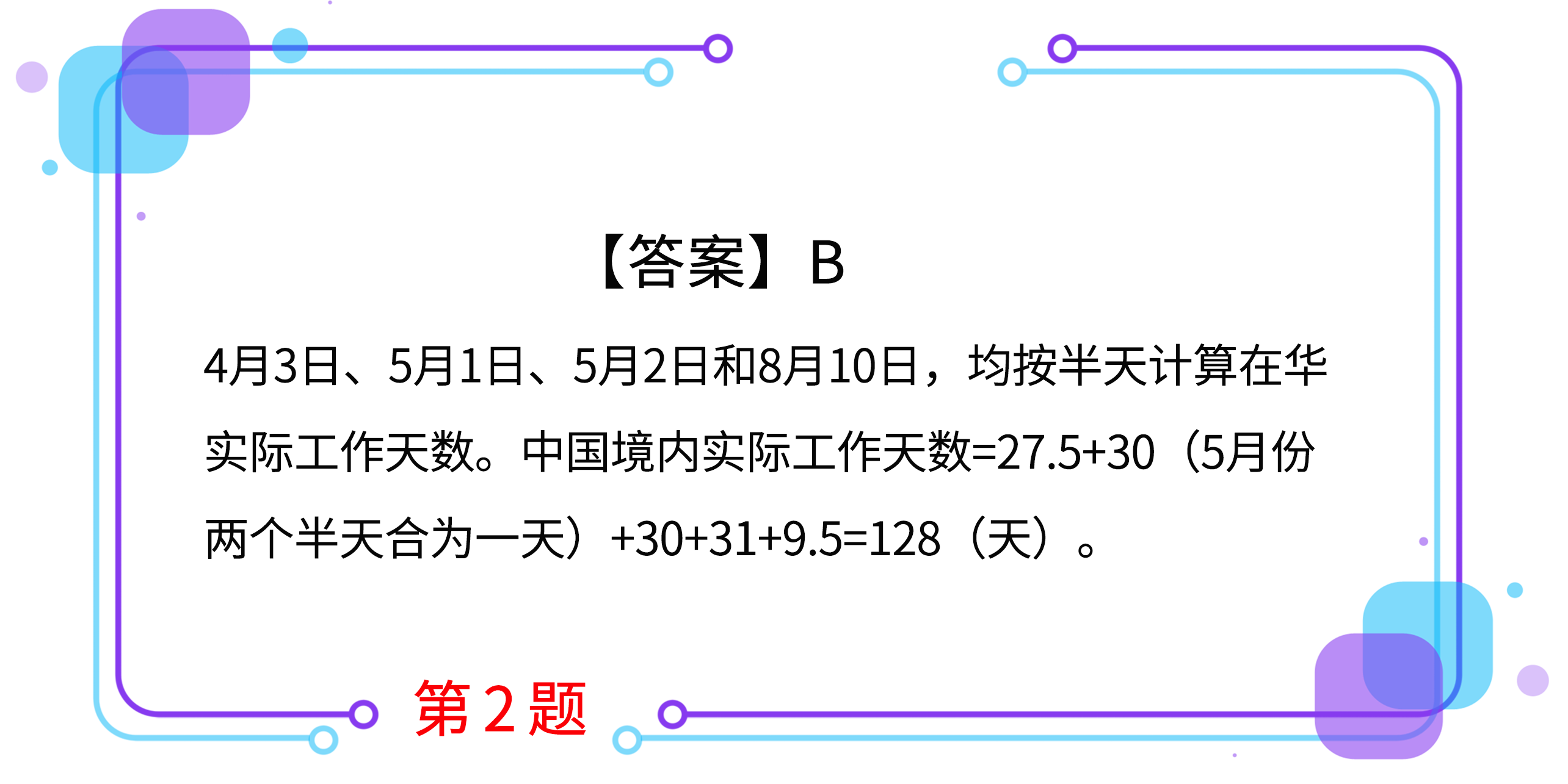 2.約翰為外籍個(gè)人,在中國(guó)境內(nèi)無住所,同時(shí)在中國(guó)境內(nèi)W公司擔(dān)任高管,2019年4月3日來華,8月10日離開。期間約翰因工作原因,曾于5月1日離境,5月2日返回。在計(jì)算個(gè)人所得稅時(shí),他在中國(guó)境內(nèi)實(shí)際工作天數(shù)為(  )天。