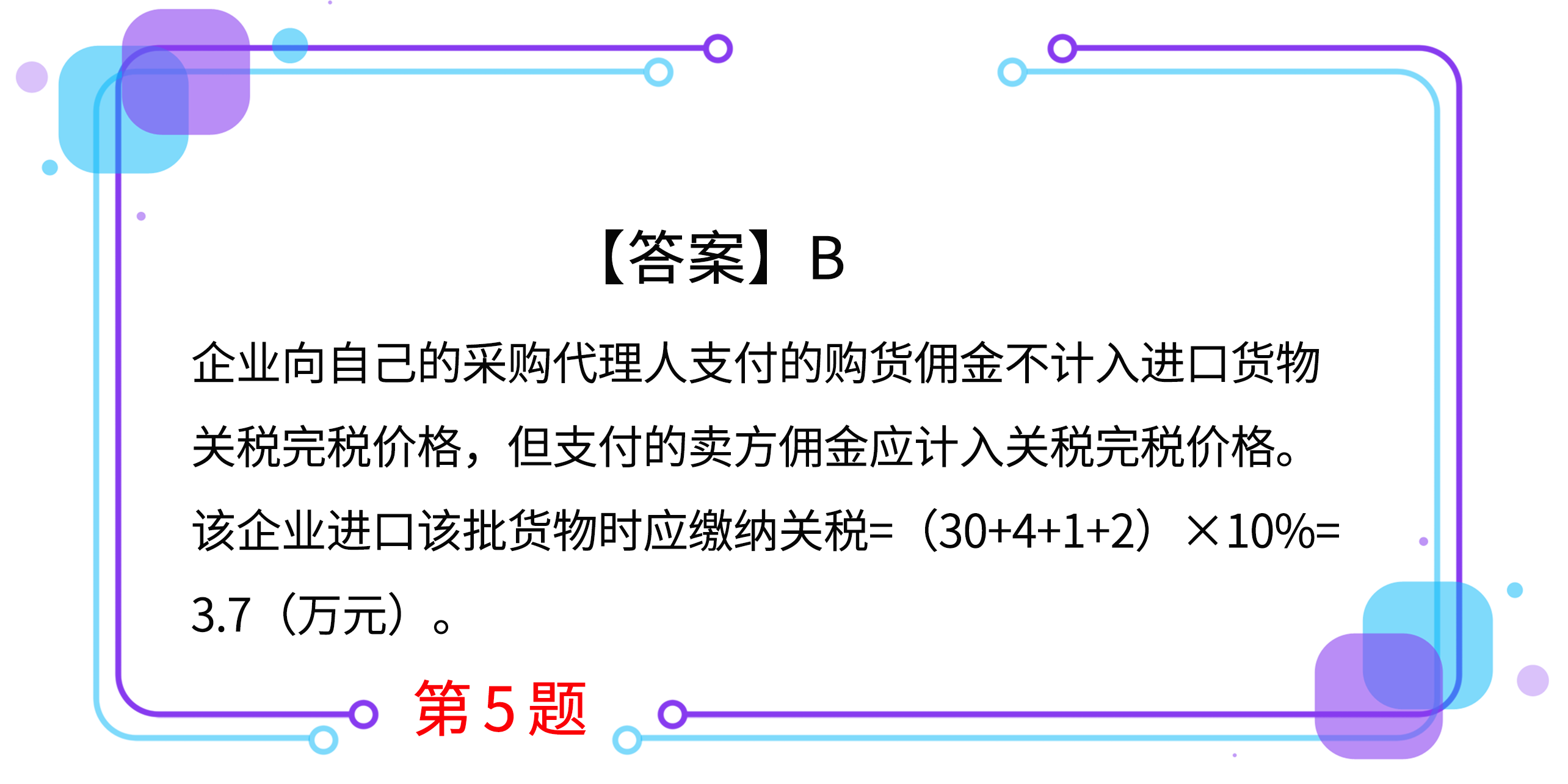5. 某企業(yè)從境外進(jìn)口一批貨物,貨物價(jià)款30萬(wàn)元(折合人民幣,下同),貨物運(yùn)抵我國(guó)境內(nèi)輸入地點(diǎn)起卸前發(fā)生運(yùn)費(fèi)4萬(wàn)元、保險(xiǎn)費(fèi)1萬(wàn)元,企業(yè)向自己的采購(gòu)代理人支付購(gòu)貨傭金0.5萬(wàn)元,支付賣方傭金2萬(wàn)元。已知該貨物進(jìn)口關(guān)稅稅率為10%,則該企業(yè)進(jìn)口該批貨物時(shí)應(yīng)繳納關(guān)稅(  )萬(wàn)元。