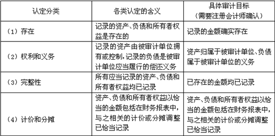 認(rèn)定與財務(wù)報表各項目的具體審計目標(biāo)密切相關(guān),注冊會計師的基本職責(zé)就是確定被審計單位管理層對其財務(wù)報表的認(rèn)定是否恰當(dāng)。