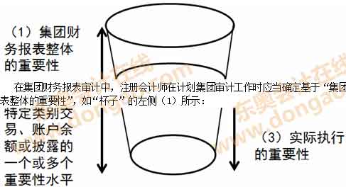 在集團(tuán)財(cái)務(wù)報(bào)表審計(jì)中,注冊會計(jì)師在計(jì)劃集團(tuán)審計(jì)工作時應(yīng)當(dāng)確定基于“集團(tuán)財(cái)務(wù)報(bào)表整體的重要性”,如“杯子”的左側(cè)(1)所示: