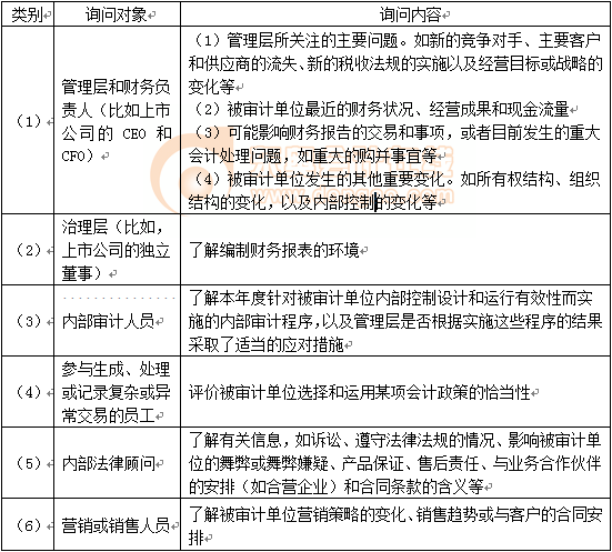 詢問管理層和被審計單位內(nèi)部其他人員是注冊會計師了解被審計單位及其環(huán)境的一個重要信息來源。