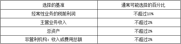 為選定的基準(zhǔn)確定百分比需要運用職業(yè)判斷。百分比和選定的基準(zhǔn)之間存在一定的聯(lián)系,如經(jīng)常性業(yè)務(wù)的稅前利潤對應(yīng)的百分比通常比營業(yè)收入對應(yīng)的百分比要高。