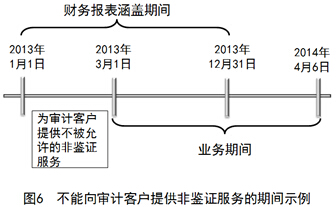 如圖6所示,如果會計師事務(wù)所在2013年1月1日至2013年3月1日期間為其審計客戶提供了不被允許的非鑒證服務(wù),將對獨(dú)立性產(chǎn)生不利影響。