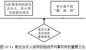 審計(jì)項(xiàng)目組前任成員或會(huì)計(jì)師事務(wù)所前任合伙人加入審計(jì)客戶,擔(dān)任董事、髙級(jí)管理人員或特定員工,必須杜絕與事務(wù)所的重要交往,包括一切經(jīng)濟(jì)利益關(guān)系。如圖22-11所示: