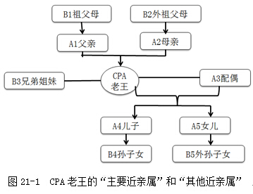 下面我們以ABC會(huì)計(jì)師事務(wù)所審計(jì)項(xiàng)目組成員CPA“老王”為例,結(jié)合注冊(cè)會(huì)計(jì)師實(shí)務(wù)操作,把CPA“老王”的“近親屬”分為主要近親屬(用A表示)和其他近親屬(用B表示),如圖21-1所示: