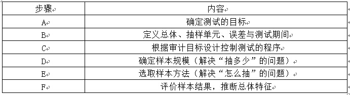 【解讀】在控制測(cè)試中使用非統(tǒng)計(jì)抽樣時(shí),抽樣的基本流程和主要步驟與使用統(tǒng)計(jì)抽樣時(shí)相同,只是在確定樣本規(guī)模(D)、選取樣本(E)和推斷總體(F)的具體方法上有所差別。