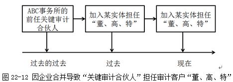 因企業(yè)合并,會計師事務所前任“關鍵審計合伙人”擔任屬于公眾利益實體的審計客戶的“董、高、特”,如圖22-12所示: