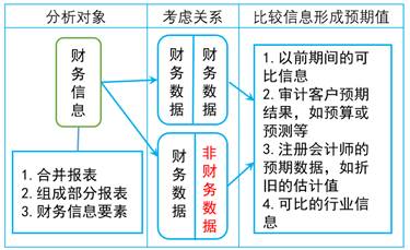 分析程序是指注冊會計師通過分析不同財務數據之間以及財務數據與非財務數據之間的內在關系,對財務信息作出評價。分析程序還包括在必要時對識別出的、與其他相關信息不一致或與預期值差異重大的波動或關系進行調查,如下圖所示。