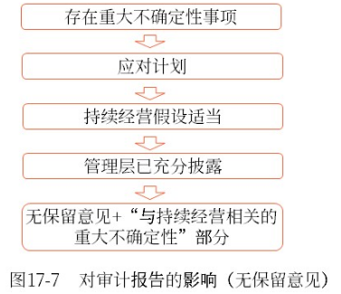 (2)說(shuō)明這些事項(xiàng)或情況表明存在可能導(dǎo)致對(duì)被審計(jì)單位持續(xù)經(jīng)營(yíng)能力產(chǎn)生重大疑慮的重大不確定性,并說(shuō)明該事項(xiàng)并不影響發(fā)表的審計(jì)意見(jiàn)。如圖17-7所示。