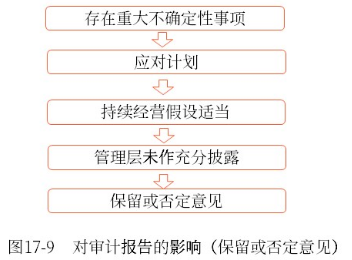 如果持續(xù)經(jīng)營(yíng)假設(shè)適當(dāng),但存在重大不確定性,且財(cái)務(wù)報(bào)表未作出充分披露,注冊(cè)會(huì)計(jì)師應(yīng)當(dāng)發(fā)表保留意見(jiàn)或否定意見(jiàn)。注冊(cè)會(huì)計(jì)師應(yīng)當(dāng)在審計(jì)報(bào)告中說(shuō)明,存在可能導(dǎo)致對(duì)被審計(jì)單位持續(xù)經(jīng)營(yíng)能力產(chǎn)生重大疑慮的重大不確定性。如圖17-9所示。