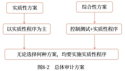 總體審計(jì)方案應(yīng)對的是評估的認(rèn)定層次重大錯(cuò)報(bào)風(fēng)險(xiǎn),包括實(shí)質(zhì)性方案和綜合性方案,如圖8-2所示。