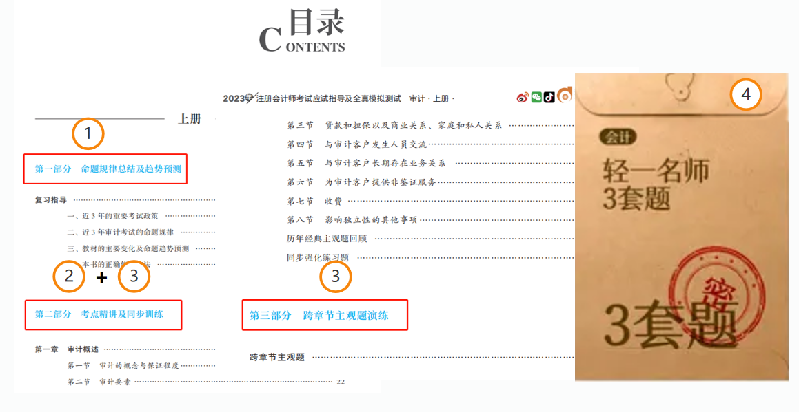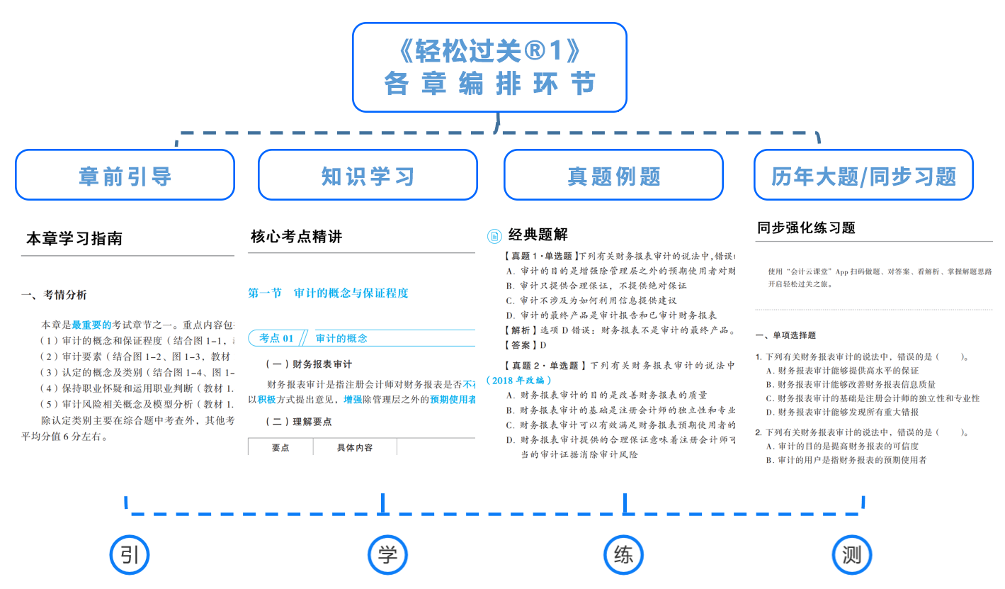 2023注會《輕一》主體可分成四個模塊,完全可以實現(xiàn)一套書,多項用途的學習作用,模塊之間關(guān)聯(lián)合作,能夠充分發(fā)揮“入門-基礎(chǔ)-強化-沖刺”全階段的備考功能。