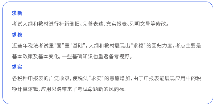 縱觀近年注會(huì)考試情況,我們能夠感受到《稅法》科目一直在向“求新”“求穩(wěn)”“求實(shí)”的風(fēng)格演變。