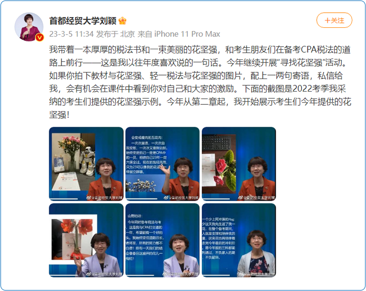注會(huì)考試難度大,備考任務(wù)艱巨,每年都有考生棄考。為鼓勵(lì)學(xué)生堅(jiān)持到底,課堂內(nèi)外,劉穎老師都會(huì)暖心鼓勵(lì)大家。劉穎老師發(fā)起的,持續(xù)多年的“尋找花堅(jiān)強(qiáng)”活動(dòng),激勵(lì)著無數(shù)的注會(huì)考生,也見證著他們?cè)竭^稅法,越過專業(yè)階段,越過注會(huì)考試,奔向自己設(shè)定的美好未來。