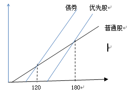 【解析】當(dāng)存在三種籌資方式時(shí),最好是畫圖來分析。畫圖時(shí)要注意普通股籌資方式的斜率要比另外兩種籌資方式的斜率小,而發(fā)行債券和發(fā)行優(yōu)先股的直線是平行的。本題圖示如下: