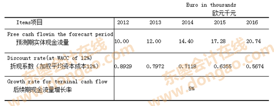 201 2年初,L集團(tuán)與H集團(tuán)的談判仍在進(jìn)行中。此時,某投行聽說L集團(tuán)有意尋求收購歐洲的機(jī)械制造企業(yè),便找到L集團(tuán)在歐洲的投資顧問B先生(一位英國人),向其推薦了Y公司,并提供了下列現(xiàn)金流量預(yù)測以及估值數(shù)據(jù),供L集團(tuán)參考。Y公司為一家上市公司,截至2011年12月30日Y公司收盤股價15歐元/股,總股數(shù)為1千萬股。2011年末凈負(fù)債為3千萬歐元。