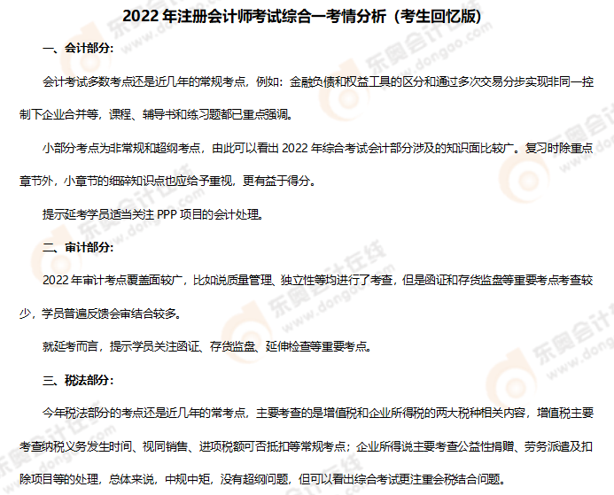 注冊會計師綜合階段試卷一已經(jīng)考完啦!以上就是東奧會計在線整理的2022年注冊會計師綜合階段試卷一考情考點分析,預(yù)祝大家順利通過注會考試,早日拿到注會證書。