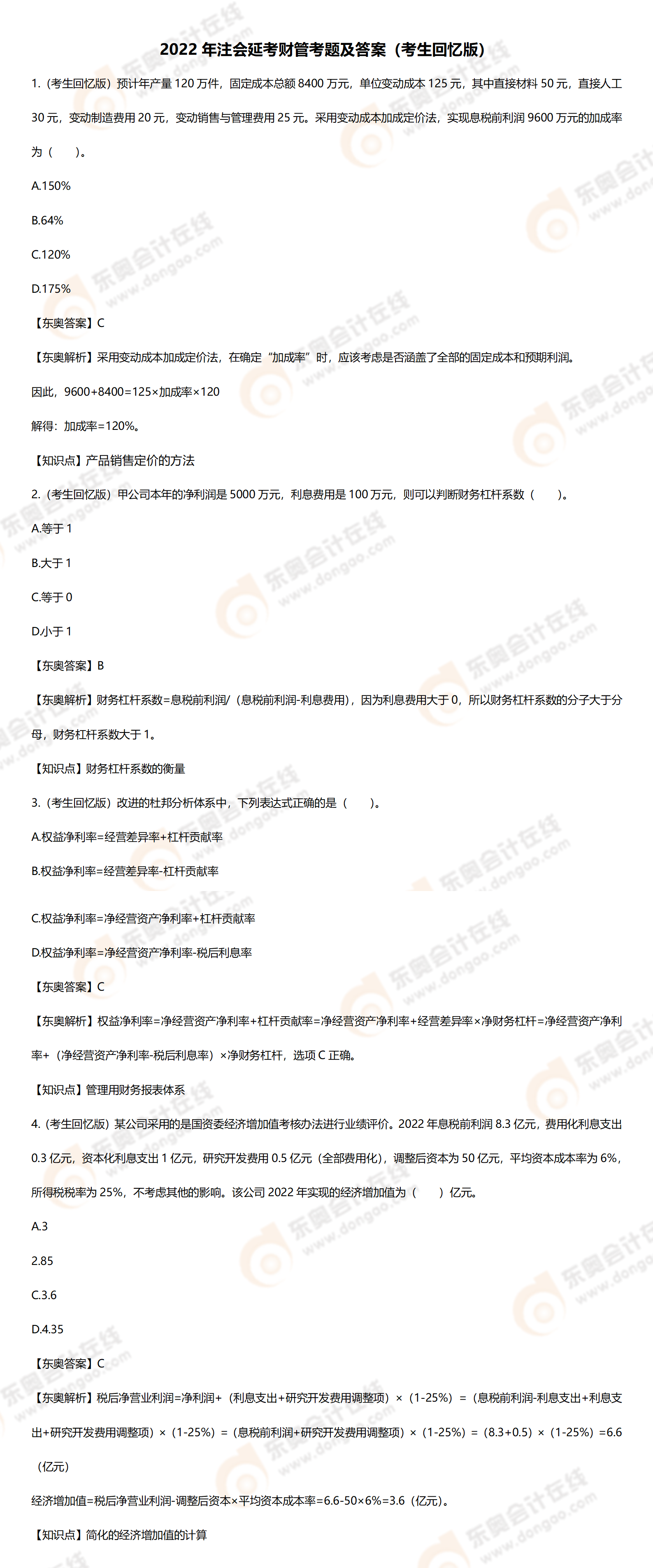 以上就是2022年CPA延考地區(qū)財(cái)管考題及參考答案的全部?jī)?nèi)容,如果考生接下來(lái)還要參加其他科目的考試,那就請(qǐng)快速調(diào)整狀態(tài),重振旗鼓,準(zhǔn)備迎戰(zhàn)剩余科目的考試!東奧會(huì)計(jì)在線祝大家都能夠順利通過(guò)CPA考試。