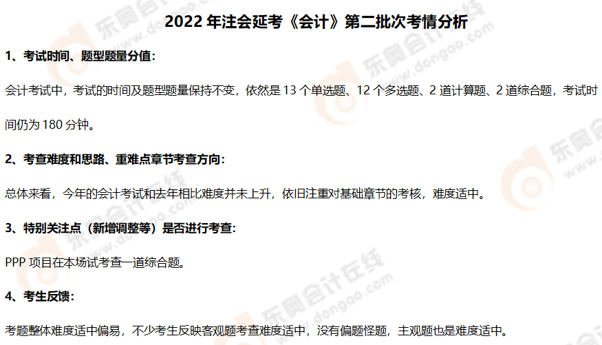 2022年注會延考《會計》第二批次考試已落下帷幕,考生們自信滿滿地走出了考場。東奧會計在線根據(jù)考生回憶反饋,為大家整理了2022年注會延考《會計》第二批次考點總結及考情分析,快來看看今年考了哪些內容!