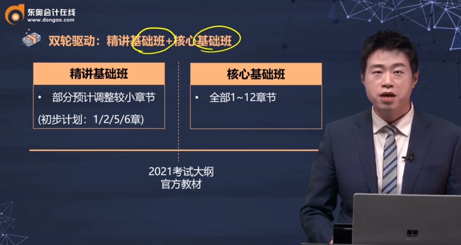 “為了應(yīng)對2021年考試提前,滿足學(xué)員提前備考需求,2021年我們東奧把原來的基礎(chǔ)班次進(jìn)行了調(diào)整,變成了雙輪基礎(chǔ)班,分別是‘精講基礎(chǔ)班’和‘核心基礎(chǔ)班’。兩個班次的區(qū)別在于,以2021年考試大綱官方教材下發(fā)時間為軸心,下發(fā)之前錄制的是‘精講基礎(chǔ)班’,講解部分預(yù)計調(diào)整較小的章節(jié),我講解第一章(法律基本原理)、第二章(基本民事法律制度)、第五章(合伙企業(yè)法律制度)、第六章(公司法律制度),如果大家感覺少,我可以加錄課程。郭守杰老師講解第五章(合伙企業(yè)法律制度)、第六章(公司法律制度)、第八章(企業(yè)破產(chǎn)法律制度)、第九章(票據(jù)與支付結(jié)算法律制度);2021年考試大綱和官方教材下發(fā)之后錄制的是‘核心基礎(chǔ)班’,該班將講解教材的全部考點(diǎn)。我要強(qiáng)調(diào)的是,我上面說的內(nèi)容設(shè)置思路僅限于《經(jīng)濟(jì)法》科目,其它科目與《經(jīng)濟(jì)法》有所不同,其它科目大家還要以其內(nèi)容設(shè)置思路為準(zhǔn)?!标愋∏蚶蠋熣f。