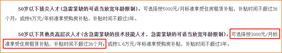 海南人才工作網(wǎng)發(fā)布的《海南省引進(jìn)人才住房補(bǔ)貼政策》規(guī)定,50歲以下其他類高層次人才(含急需緊缺的技術(shù)技能人才,急需緊缺的可適當(dāng)放寬年齡限制):可選擇按3000元/月標(biāo)準(zhǔn)享受住房租賃補(bǔ)貼,補(bǔ)貼時(shí)間不超過(guò)36個(gè)月;或按3.6萬(wàn)元/年標(biāo)準(zhǔn)享受購(gòu)房補(bǔ)貼,補(bǔ)貼時(shí)間不超過(guò)3年。