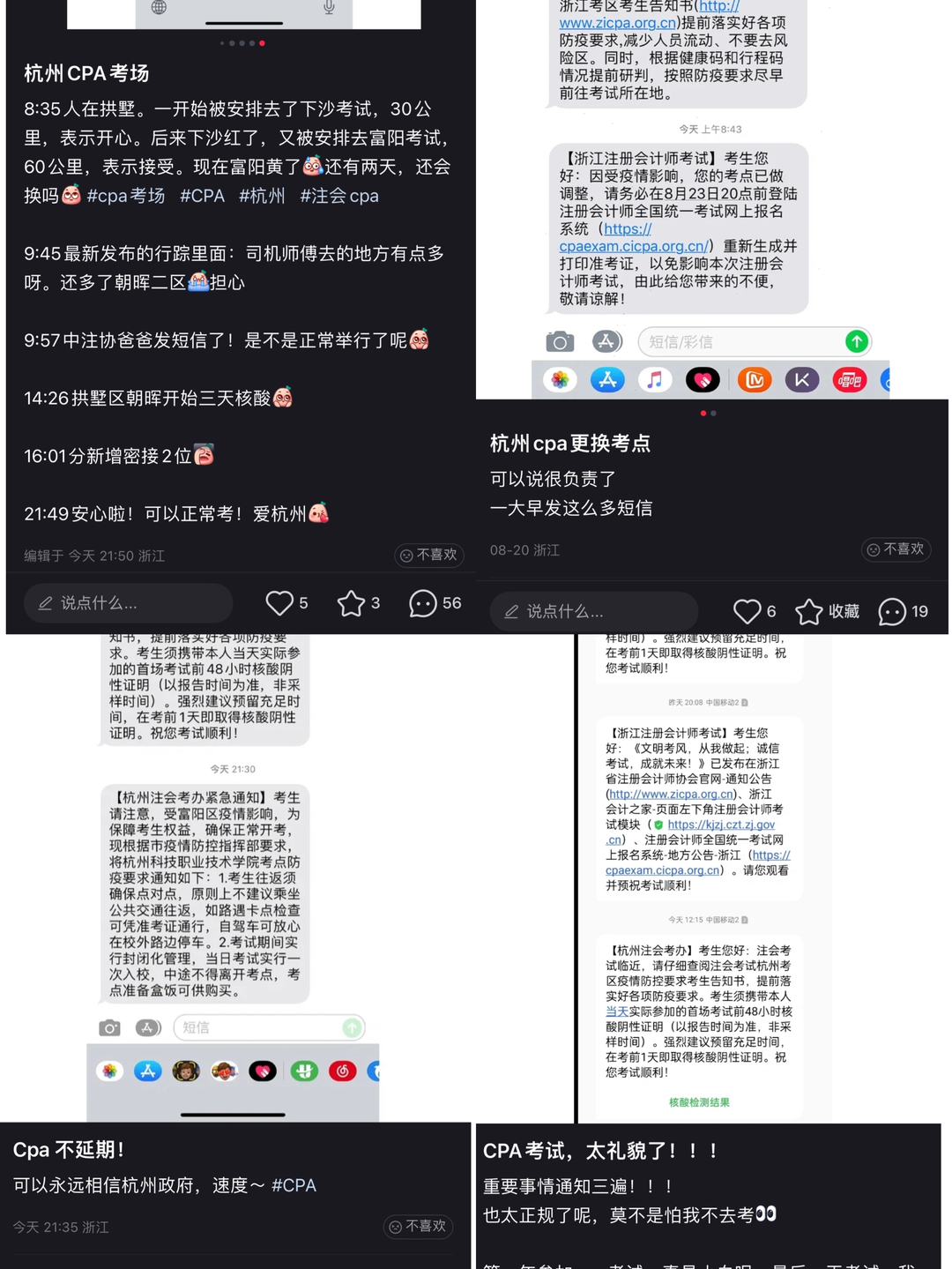 一波未平一波又起,才妥善處理好考點(diǎn)遷移工作,開考前一天,又傳來富陽疫情消息。此時距離考試不足24小時,臨時更換富陽考點(diǎn)已不現(xiàn)實(shí),如取消該考點(diǎn),將影響杭州考區(qū)全體考生。注會考試作為高含金量的執(zhí)業(yè)準(zhǔn)入考試,取消不僅僅是浪費(fèi)考生時間金錢,更關(guān)鍵是可能會影響考生的前途,社會影響極大。杭州考區(qū)以高度的政治敏銳性,第一時間快速應(yīng)對。最終經(jīng)過多方努力,在科學(xué)研判本地疫情、要求考點(diǎn)封閉式管理的前提下,保留富陽考點(diǎn),杭州考區(qū)得以正常開考。為落實(shí)封閉式管理要求,杭州考區(qū)還緊急協(xié)調(diào)考點(diǎn)及屬地交警,安排考生休息室、就餐、停車等事宜,并第一時間短信告知考生注意事項(xiàng)。