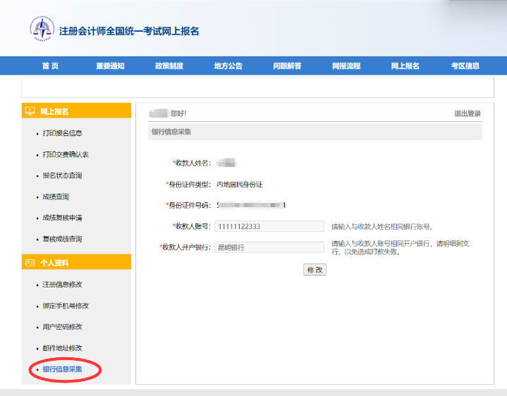 1.請(qǐng)登錄“注冊(cè)會(huì)計(jì)師全國(guó)統(tǒng)一考試網(wǎng)上報(bào)名系統(tǒng)https://cpaexam.cicpa.org.cn/”,在“銀行信息采集”欄目中進(jìn)行填報(bào)。
