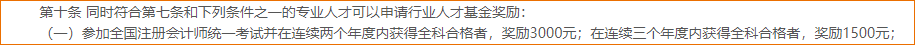 根據(jù)《福建省注冊(cè)會(huì)計(jì)師行業(yè)人才基金管理辦法(試行)》規(guī)定,在福建,參加全國(guó)注冊(cè)會(huì)計(jì)師統(tǒng)一考試并在連續(xù)兩個(gè)年度內(nèi)獲得全科合格者,獎(jiǎng)勵(lì)3000元;在連續(xù)三個(gè)年度內(nèi)獲得全科合格者,獎(jiǎng)勵(lì)1500元。【注會(huì)報(bào)名入口直達(dá)>>】