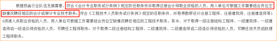 為促進(jìn)職稱制度與職業(yè)資格制度有效銜接,減少重復(fù)評(píng)價(jià),降低社會(huì)用人成本,福建省人社局官網(wǎng)發(fā)布《關(guān)于建立部分專業(yè)技術(shù)職業(yè)資格和職稱對(duì)應(yīng)關(guān)系的通知》。通知中寫道,符合《會(huì)計(jì)專業(yè)職務(wù)試行條例》規(guī)定的任職條件并取得注冊(cè)會(huì)計(jì)師職業(yè)資格的人員,用人單位可根據(jù)工作需要結(jié)合崗位空缺情況聘任相應(yīng)的會(huì)計(jì)或?qū)徲?jì)專業(yè)技術(shù)職務(wù)。