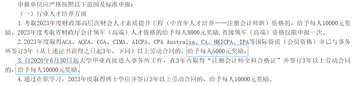 近日,江蘇省注冊(cè)會(huì)計(jì)師協(xié)會(huì)發(fā)布了《關(guān)于組織申報(bào)2024年江蘇省注冊(cè)會(huì)計(jì)師行業(yè)人才專項(xiàng)資金獎(jiǎng)補(bǔ)項(xiàng)目的通知》,通過(guò)注會(huì)考試并符合條件的人員可以申報(bào)領(lǐng)取最高10000元的獎(jiǎng)勵(lì)資金。