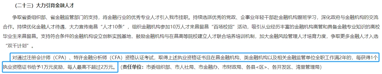 在南昌市人民政府印發(fā)的《關(guān)于打造區(qū)域金融中心 加快金融業(yè)高質(zhì)量發(fā)展的實(shí)施意見》的通知中我們能夠知道,對(duì)通過注冊(cè)會(huì)計(jì)師(CPA)資格認(rèn)證考試,取得執(zhí)業(yè)資格證書且在昌金融機(jī)構(gòu)、類金融機(jī)構(gòu)以及相關(guān)金融監(jiān)管單位全職工作滿2年的,每獲得1個(gè)執(zhí)業(yè)資格證書給予1萬元獎(jiǎng)勵(lì),每人最高不超過2萬元。